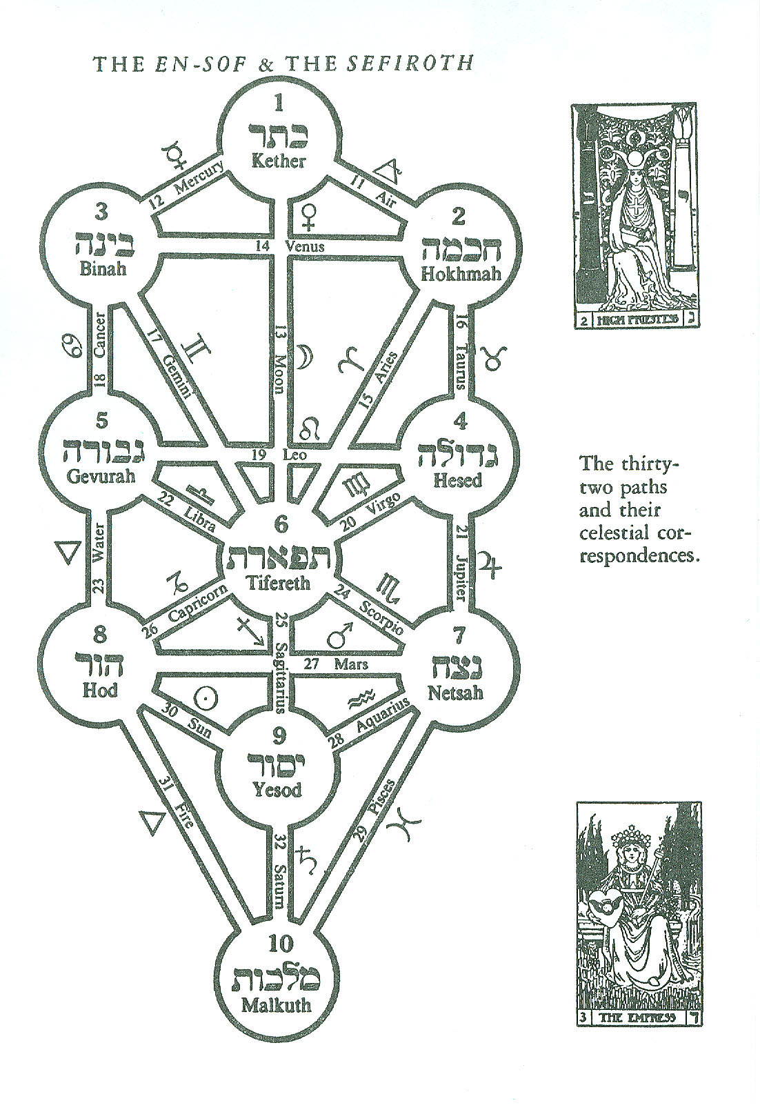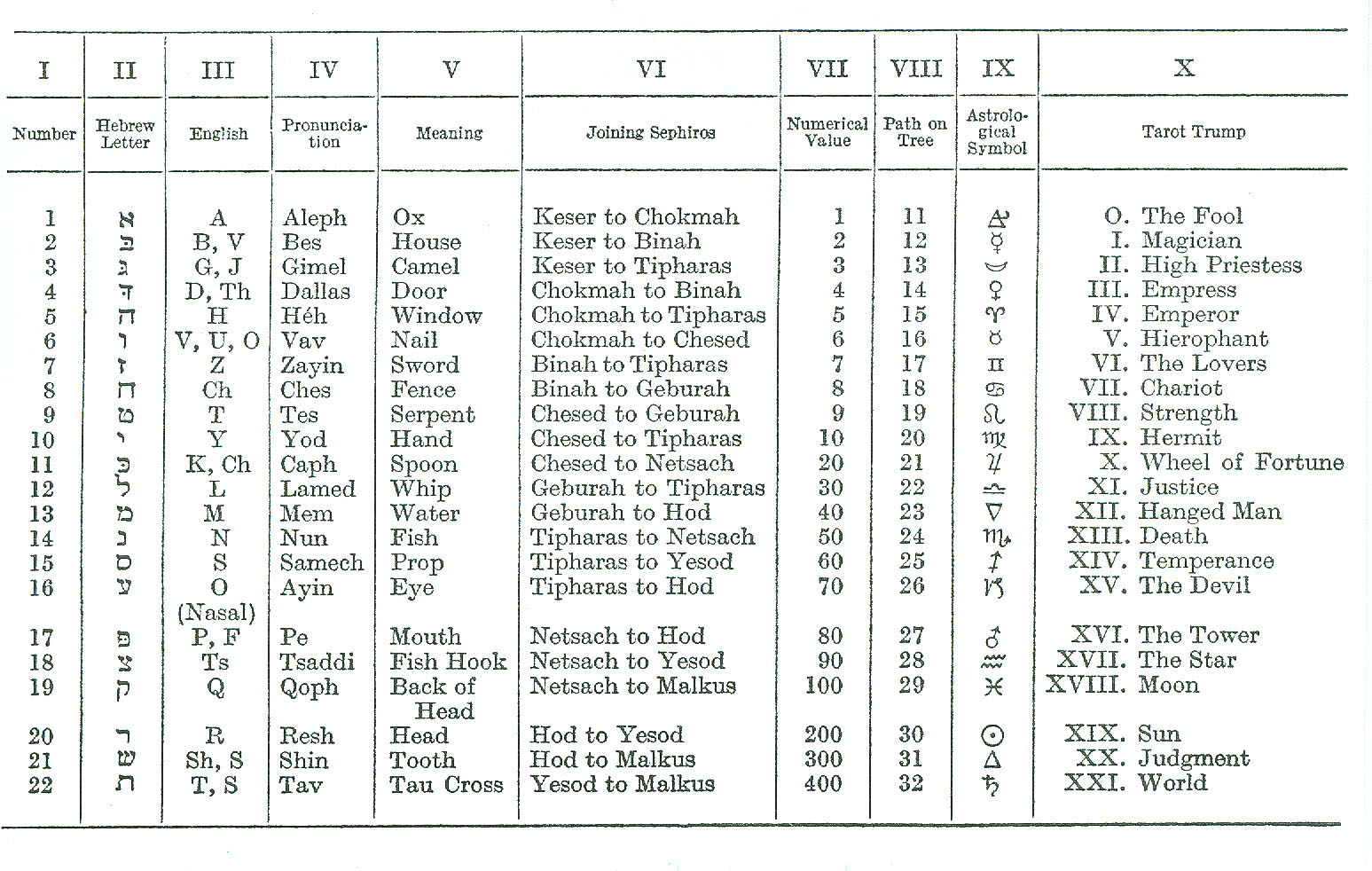 “Our next consideration of the Sefiroth will be with the [twenty-two] paths [letters of the Hebrew alphabet (Tarot)], the connecting links between the Sefiroth. . . [The] illustration sets out the number of each path. . . with the letter of the Hebrew alphabet [or Archetype] assigned it. The nature of [each] path is determined not only by the letter assigned it, but by the two Sefiroth which it connects.” (CP, Kabbalah, p.157)