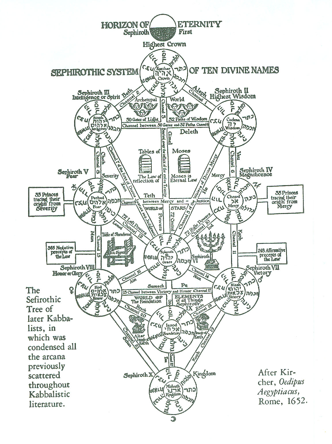 From the “One” to the “Many” — “QabbÄ�lÄ�h deals in large part with the doctrine of emanation. It describes in pictorial fashion a tree of life . . . formed of ten emanations or sefiroth, issuing forth from the Boundless (‘ein sof). Sefirah means ‘number’ or ‘emanation’ — the concept of the universe being established in and on numbers is found also in the doctrines of Pythagoras. . . The Sefirothal Tree is a symbol of man, atom, star or any other hierarchy. It depicts . . . the series of emanations that the One or divine monad of any being unfolds from within itself in assuming full imbodiment. . .