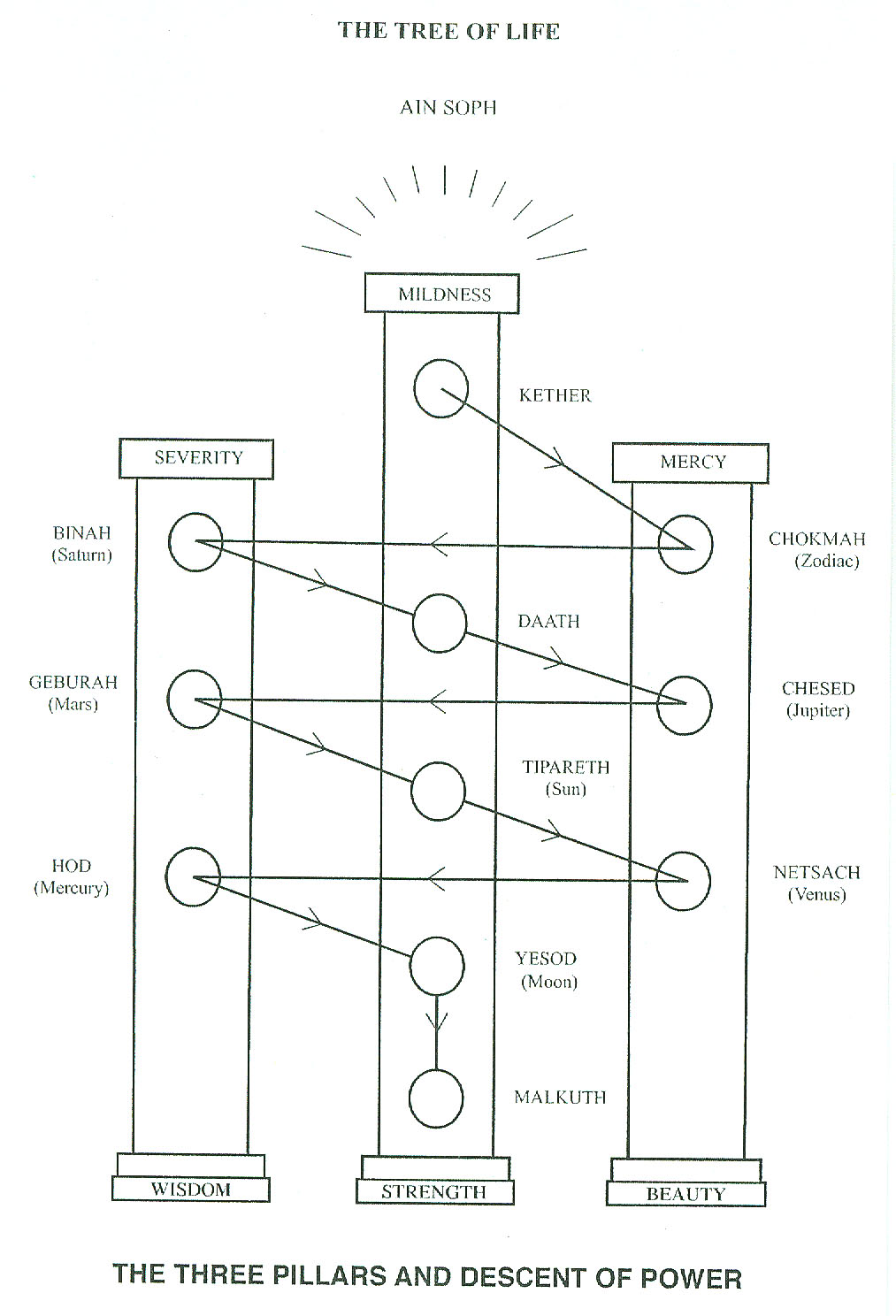 “In addition to the relationships to be found in the triadic divisions of the Sefiroth . . . there is another configuration of the Sefiroth in which they are arranged into the three pillars of Mercy, the Middle [or Blalance (mildness)] & Judgment [severity].