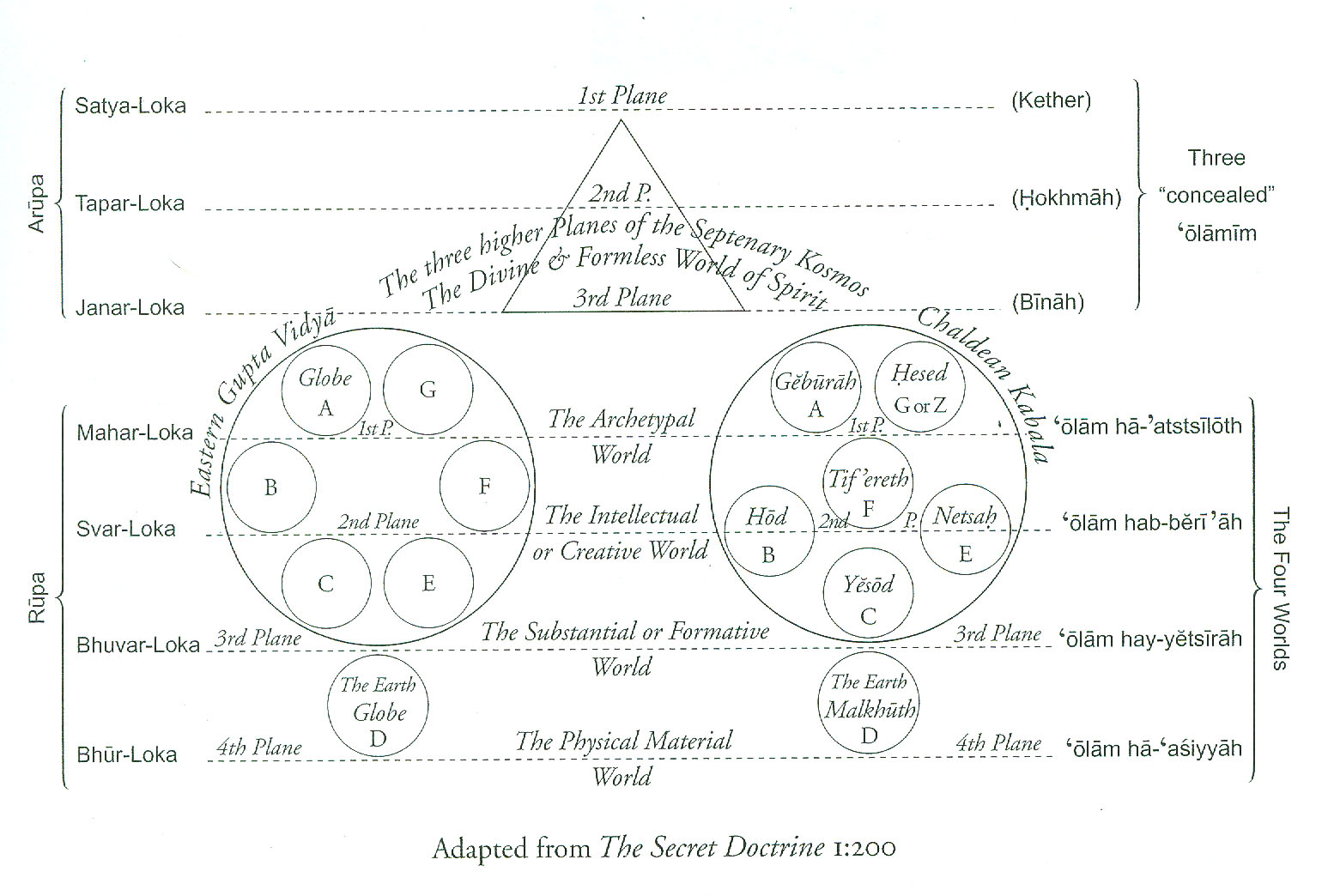 “The . . . diagram reproduced from The Secret Doctrine shows HPB’s comparison of the Eastern Gupta-Vidya (secret wisdom) with the Chaldean QabbÄ�lÄ�h. We have here seven cosmic planes, three of which remain unnamed and undefined because they are of so spiritual and ethereal a quality as to be incomprehensible to our terrestrial intellect. In modern theosophical literature these three higher planes are called in Sanskrit arupa, ‘formless’, (. . . without a body . . .). But they are just as real and vital in the consciousness of those supernal beings who inhabit and vivify those spheres as our earth is to us. . . . HPB writes: ‘The three upper are the three higher planes of consciousness, revealed and explained in both schools only to the Initiates, the lower ones represent the four lower planes — the lowest being our plane, or the visible Universe’ (SD 1:199). These three upper planes, in which the supernal triad of Kether, Hokhmah and Binah are dominant, cannot be reached by the ordinary consciousness, as the individual ‘must awaken the three “seats” to life and activity. And how many are capable of bringing themselves to even a superficial comprehension of Atma-Vidya (Spirit-Knowledge) . . .’ (ibid).” (GFK, pp.55-57)