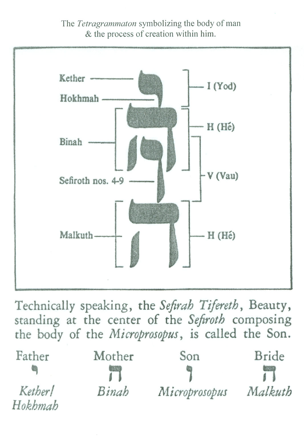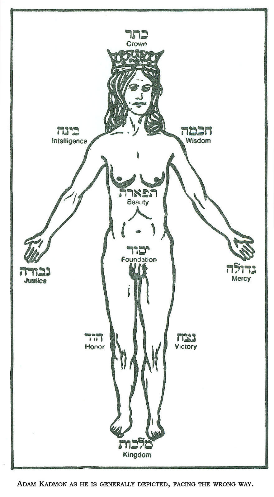 “Yesod — Foundation . . . is symbolic of both male and female genitals. This Sefirah completes the last triadic division of the Sefiroth, the triad representative of the result of God’s reproductive or creative power, the material world. It symbolically represents the sixth day of Genesis when God created Adam & Eve . . . [and] is also the last of the six members of the Microprosopus. . . Mercy is his right arm, Judgment or Power is his left arm, Beauty is his trunk, Victory is his right leg, Majesty or Glory is his left leg, & Foundation are his reproductive organs.
